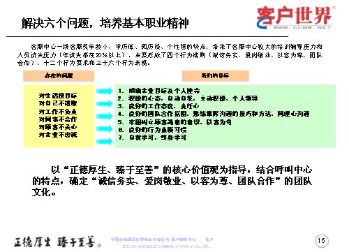 一線客服人員如何來(lái)全面提升職業(yè)能力,首先是解決一線客服人員的六個(gè)問(wèn)題,剛才已經(jīng)跟大家交流了客服中心一線人員的人員結(jié)構(gòu),當(dāng)前的六個(gè)主要問(wèn)題可以用簡(jiǎn)單的幾個(gè)方面來(lái)表述:對(duì)生活沒(méi)有明確的目標(biāo)、對(duì)自己不進(jìn)取、對(duì)工作不負(fù)責(zé)、對(duì)同事不合作、對(duì)顧客不關(guān)心、對(duì)企業(yè)不忠誠(chéng),這是在日常工作中,一線人員所存在的問(wèn)題。而針對(duì)這些問(wèn)題,我們要用工作目標(biāo)去持續(xù)解決和克服問(wèn)題,所以我們采取的是讓大家明確企業(yè)目標(biāo)與個(gè)人使命,用積極的心態(tài)自主自發(fā),主動(dòng)積極和個(gè)人領(lǐng)導(dǎo);良好的工作態(tài)度責(zé)任心,良好的團(tuán)隊(duì)合作氛圍;熟練掌握溝通技巧和方法,牢固樹(shù)立顧客滿意的意識(shí),以客為尊;良好的行為素質(zhì)習(xí)慣,自我學(xué)習(xí),終身學(xué)習(xí)。從而在中國(guó)移動(dòng)集團(tuán)“正德厚生、臻于至善”的核心價(jià)值觀指導(dǎo)下,結(jié)合呼叫中心特點(diǎn),確定誠(chéng)實(shí)務(wù)信,愛(ài)崗敬業(yè),以客為尊、團(tuán)隊(duì)合作的團(tuán)隊(duì)文化。