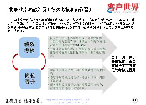 職業(yè)素養(yǎng)不是說(shuō)在嘴上,講在課上,而是更多地融入到員工的績(jī)效考核于崗位晉升當(dāng)中。以解決工作素養(yǎng)要求和實(shí)際工作的兩張皮,以及使得客服理念成為理論的空中樓閣。所以我們是持之以恒地開(kāi)展一線員工組織認(rèn)同滿意度調(diào)查,我們每年都會(huì)做一線客服人員的滿意度調(diào)查,在滿意度調(diào)查當(dāng)中,從05年的69.3%,提升到07年的73.9%,而且遙遙領(lǐng)先于營(yíng)業(yè)員和客服經(jīng)理。而在績(jī)效考核中主要把員工行為素質(zhì)、團(tuán)隊(duì)合作占到了員工月度績(jī)效的16.5%,使大家認(rèn)識(shí)到作為一個(gè)組織中的一員,作為團(tuán)隊(duì)我們是為了一個(gè)共同的目標(biāo),彼此依賴、彼此信任,同時(shí)也要強(qiáng)化績(jī)效來(lái)管理。所以主要的評(píng)分依據(jù)是客觀、可衡量、有依據(jù)可查,同時(shí)也把這些也作為客服人員季度晉升和月度績(jī)效考評(píng)掛鉤,如果該員工季度的平均考核在良好以下的話,將得不到晉升,最終實(shí)現(xiàn)的是員工行為可評(píng)價(jià),評(píng)價(jià)標(biāo)準(zhǔn)可衡量,衡量結(jié)果可考核,最終考核定晉升。
