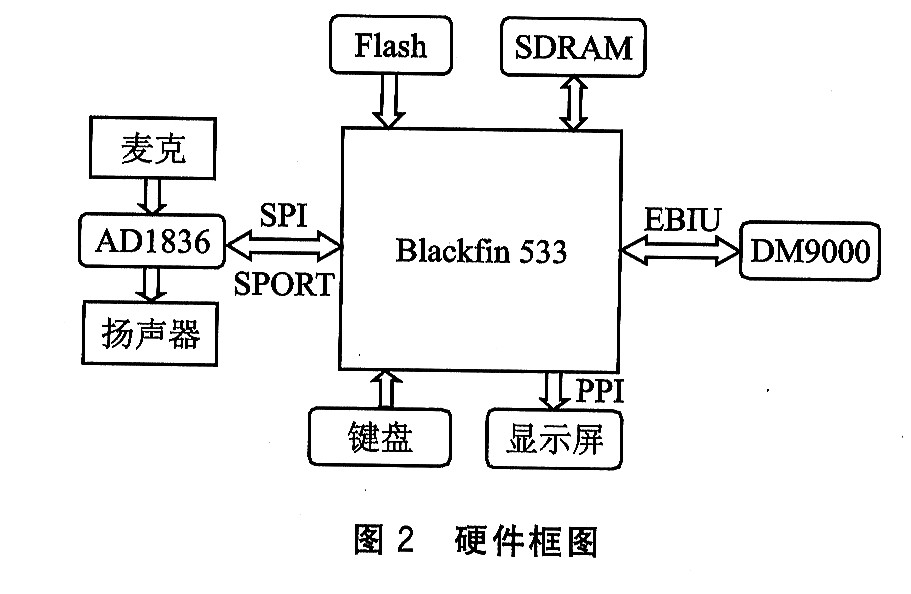 Blackfin 533為核心處理器芯片。外圍輔以ADl836實(shí)現(xiàn)語音信號的采集和播放;DM9000實(shí)現(xiàn)網(wǎng)絡(luò)數(shù)據(jù)包的收發(fā);TFT