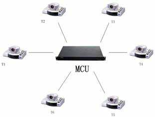 在會議場點數(shù)目不多且地域分布比較集中時,可采用單MCU方式,其組網(wǎng)結構見圖所示。圖中T1-T6均為視頻會議終端系統(tǒng)設備。