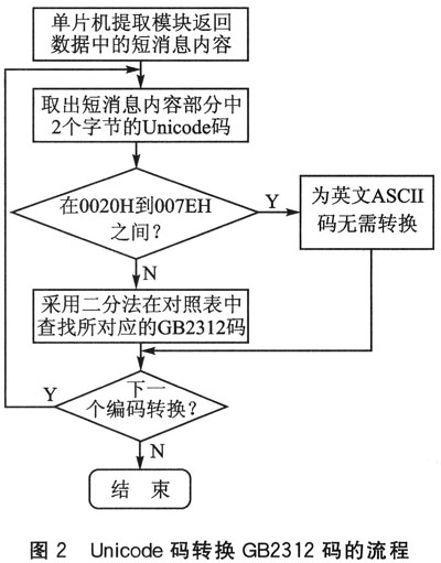 單片機通過串口與模塊連接后,發(fā)送讀取第一條新短消息指令:“AT+CMGR=1”。提取模塊接收的短消息后,先判斷其內(nèi)容是否為ASCII碼。若為ASCII碼,則無需轉(zhuǎn)換直接讀。环駝t,通過查表法查找其對應(yīng)的漢字GB碼,實現(xiàn)不同編碼間的轉(zhuǎn)換。轉(zhuǎn)換流程如圖2所示。