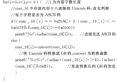 經(jīng)研究比較發(fā)現(xiàn),所要提取的短信信息包括手機號碼、時間和短信內(nèi)容。在Text模式下時間和日期均為ASCII碼,可直接讀取,只需將內(nèi)容中漢字部分的Unicode碼轉(zhuǎn)換成國標(biāo)碼;而在PDU模式下除漢字編碼轉(zhuǎn)換外,還需將號碼、時間部分編碼進(jìn)行兩兩顛倒的轉(zhuǎn)換,才能得到所需的正確信息。故在系統(tǒng)設(shè)計中將GSM模塊設(shè)為Text模式,更能簡化程序設(shè)計。