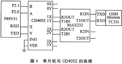 本設(shè)計中,A、B分別占用P2.0和P2.1口,P2=0x01則選通模塊串口,P2=0x02則接通其他串口設(shè)備。當(dāng)INH為1時,所有通道均關(guān)閉。X、Y分別連接單片機的RXD和TXD,則可將一個串口擴展為4個,具體接線方法如圖4所示。