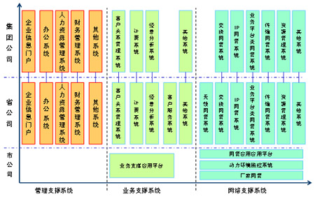 從系統(tǒng)的部署來看,主要集中在集團與省公司,其中,集團公司系統(tǒng)主要具備面向全公司的企業(yè)管理、經(jīng)營分析等功能;省公司從以職能管理為主逐步轉(zhuǎn)變?yōu)橐陨a(chǎn)管理為主,具有了越來越多的生產(chǎn)職能,在運營支撐系統(tǒng)建設(shè)中的作用更加突出;市公司的生產(chǎn)管理職能有所削弱,將主要負(fù)責(zé)市場的具體營銷、客戶支撐以及設(shè)備的現(xiàn)場維護等工作,F(xiàn)有系統(tǒng)主要存在以下幾個問題: