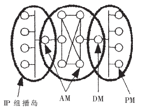 混合式組播的核心任務是為AM完成拓撲(包括數(shù)據(jù)拓撲和控制拓撲)的構建。由于網(wǎng)絡狀況的動態(tài)性,以及客戶端數(shù)量與客戶端加入系統(tǒng)時間的不確定性,當前的應用層組播方案一般需要每個結點定期與其他全部或一定比例的結點交換控制信息,以了解其他結點的狀態(tài),形成控制拓撲,保障數(shù)據(jù)拓撲的健壯性。在結點個數(shù)逐漸增加時,網(wǎng)絡上的控制信息數(shù)量會占用大量的帶寬資源。應用層組播的數(shù)據(jù)拓撲可分為二大類:信源樹和共享樹。信源樹必須為每個組播源保存路由信息,這樣會占用大量的系統(tǒng)資源。共享樹傳輸延時較大。IP視頻會議系統(tǒng)屬于實時交互應用,視音頻數(shù)據(jù)占據(jù)很大的帶寬,并且對端到端傳輸延遲和網(wǎng)絡抖動的要求很高,需要尋找一種既可以減少交換控制信息又可以保證視音頻數(shù)據(jù)實時傳輸?shù)耐負錁嫿ǚ绞健槔门帕袌D的優(yōu)越特性(如結點和邊的對稱性、故障恢復能力和容錯能力、可以嵌入獨立的組播樹等),這里采用分層排列圖的結構來組織混合式組播中的AM。