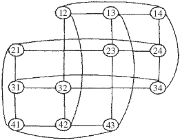 一個排列圖實例A4,2的拓撲結構如圖2所示。排列圖An,2僅能容納n(n-1)個主機。為使系統(tǒng)可容納任意多主機,可將參與主機組合成多個An,2結構,這些An,2按照樹形結構連接在一起,稱為分層排列圖結構[6]。