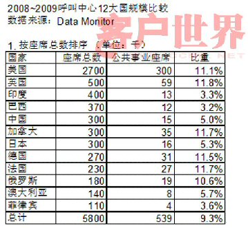 根據(jù)Data Monitor公司近年的分析報(bào)告,12呼叫中心大國(guó)在2008~2009年度共有呼叫中心座席580萬(wàn)個(gè),其中公共事業(yè)類呼叫中心座席54萬(wàn)個(gè),占9.3%。
