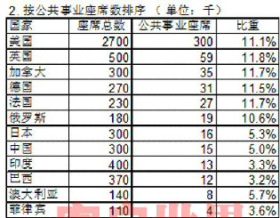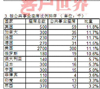 美國(guó)擁有全世界最多的座席,達(dá)到270萬(wàn)個(gè),公共事業(yè)座席30萬(wàn)個(gè),占11.1%;除美國(guó)以外,公共事業(yè)類座席總數(shù)排名在第2~6名的依次是:英國(guó),加拿大,德國(guó),法國(guó),俄羅斯。