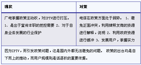 IPTV目前遇到的廣電阻力,主要源于和廣電有線網(wǎng)絡(luò)公司所推進(jìn)的數(shù)字電視的業(yè)務(wù)競(jìng)爭(zhēng),而有線網(wǎng)絡(luò)通過(guò)和廣電局的關(guān)聯(lián)關(guān)系,引發(fā)IPTV政策干擾和內(nèi)容屏蔽。