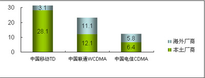 在3G設備市場方面,2008年,中國的WCDMA、CDMA2000與TD-SCDMA三種3G網絡在建設上有不同的進展。中國移動啟動了第二階段的TD-SCDMA網絡建設、中國電信啟動了涉及面向81個重點城市的CDMA全網招標、而中國聯(lián)通也開始7個城市建立WCDMA試驗網絡的建設工作。而在所有的網絡建設中,中國本土廠商借3G契機迅速提升競爭力,占據了3G網絡建設大部分市場份額。
