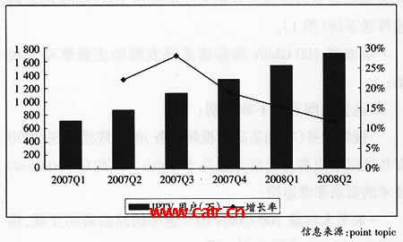 Play業(yè)務(wù),AT&T、Verizon等電信運營商也積極開展IPTV業(yè)務(wù),并且用戶規(guī)模迅速增長,截至2008年第二季度,美國的IPTV用戶達(dá)到249萬。亞太各個國家和地區(qū)的IPTV業(yè)務(wù)發(fā)展情況差異很大,中國香港的PCCW是目前IPTV用戶規(guī)模最大的電信運營商,截至2008年第二季度,PCCW的IPTV業(yè)務(wù)“now