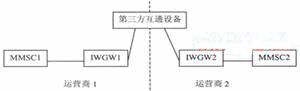 為實(shí)現(xiàn)不同運(yùn)營(yíng)商的用戶(hù)之間相互發(fā)送和接收多媒體消息,需要在不同運(yùn)營(yíng)商的多媒體消息中心之間實(shí)現(xiàn)互通。該互通需要多媒體消息中心(MMSC)與互通設(shè)備(IWGW)的連接、IWGW之間的連接實(shí)現(xiàn)。當(dāng)一個(gè)運(yùn)營(yíng)商的網(wǎng)絡(luò)用戶(hù)向另一個(gè)運(yùn)營(yíng)商的網(wǎng)絡(luò)用戶(hù)發(fā)送多媒體消息時(shí),該多媒體消息經(jīng)發(fā)送方用戶(hù)歸屬的MMSC通過(guò)IWGW提交給接收方用戶(hù)歸屬的多媒體消息中心,由接收方用戶(hù)歸屬的MMSC向其網(wǎng)內(nèi)用戶(hù)發(fā)送。網(wǎng)間多媒體消息業(yè)務(wù)互通網(wǎng)絡(luò)結(jié)構(gòu)中主要包括多媒體消息中心(MMSC),互通設(shè)備(IWGW)以及相關(guān)的輔助設(shè)備等。IWGW是指不同運(yùn)營(yíng)商網(wǎng)絡(luò)之間的多媒體消息互通設(shè)備。網(wǎng)間多媒體消息互通設(shè)備間的互聯(lián)可以由兩個(gè)運(yùn)營(yíng)商的IWGW直接連接,也可以經(jīng)過(guò)第三方互通設(shè)備轉(zhuǎn)接(見(jiàn)圖1、圖2)。