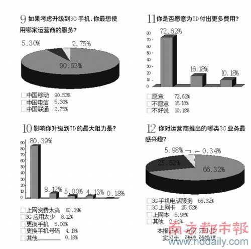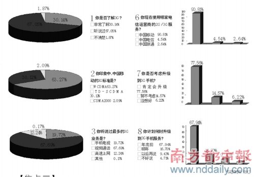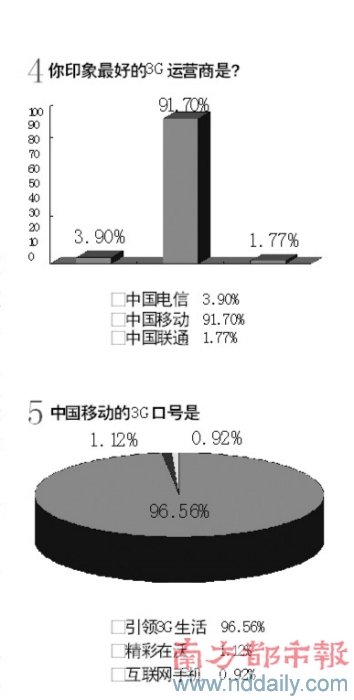 1、中國移動的3G口號是?超過98%的被訪者選擇了“引領(lǐng)3G生活”這一正確選項。2、你是否考慮升級到3G手機?選擇“會升級”的接近80%。如果考慮升級到3G手機,你最想使用哪家運營商的服務(wù)?中國移動奪得了超過九成的選票。但當(dāng)最后問到,“你印象中,中國移動的3G標準是?”時,正確選項T D -SCD M A的得票率竟只有三成左右。