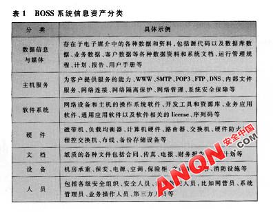 BOSS系統(tǒng)涉及的信息繁多,如何保護(hù)關(guān)鍵的數(shù)據(jù)不被泄漏是運(yùn)營(yíng)商非常重視的一個(gè)問(wèn)題。信息分級(jí)用來(lái)評(píng)估運(yùn)營(yíng)商是否建立了信息資產(chǎn)管理的規(guī)范,明確了信息資產(chǎn)的內(nèi)容和級(jí)別,制定了有效的安全保護(hù)措施,如果沒(méi)有,應(yīng)該明確BOSS系統(tǒng)內(nèi)的關(guān)鍵信息資產(chǎn)并列出清單,依據(jù)國(guó)家保密級(jí)別制定科學(xué)的信息資產(chǎn)分級(jí)標(biāo)準(zhǔn),并作為風(fēng)險(xiǎn)評(píng)估的依據(jù)。參照國(guó)際信息系統(tǒng)安全標(biāo)準(zhǔn)BS7799/ISO17799對(duì)信息資產(chǎn)的描述和定義,可以將BOSS系統(tǒng)信息資產(chǎn)按照表1的方法進(jìn)行分類。