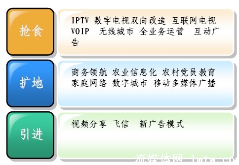 從廣義上講,廣電、電信、互聯(lián)網(wǎng)都屬于信息行業(yè),現(xiàn)在都面臨著自己在增長中遇到的問題,也就是滯漲。滯漲逼迫大家必須去轉型,轉型現(xiàn)在有三種方式,一個是搶,一個是擴,一個是引進。從最近會議上來看,目前大家對搶食比較感興趣,畢竟有現(xiàn)成的一碗紅燒肉已經(jīng)做好了,對后面兩個,相對來說談得還比較少,因為后面兩個,需要引入一些創(chuàng)新的技術,引入創(chuàng)新的思維。