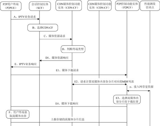 - 獲得相關(guān)信息后,P2PCF根據(jù)接入網(wǎng)資源占用情況、從CDN-CF獲取的CDN-MF列表、存儲相關(guān)資源的P2P終端狀態(tài),生成供P2PUE下載節(jié)目片段的列表。
