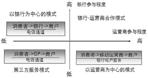 系統(tǒng),通過定制終端,電信運營商可以將各種先進的移動應用提供給用戶,使用戶獲得良好的移動化生活體驗。因此,電信運營商在移動支付方面具有較好的用戶資源和營銷渠道?梢姡娦胚\營商和銀行的協(xié)作程度在很大程度上決定了移動支付商業(yè)模式的績效水平。