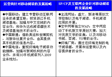 隨著3G的啟動,越來越多的傳統(tǒng)互聯(lián)網(wǎng)巨頭、運營商、手機廠商等紛紛介入無線互聯(lián)網(wǎng)領(lǐng)域,而更多的新興企業(yè)也加入到競爭中來。從目前市場的發(fā)展情況來看,運營商由于其依托的用戶資源以及對網(wǎng)絡(luò)資源的控制,在移動閱讀產(chǎn)業(yè)中占據(jù)了優(yōu)先的主動權(quán),然而針對移動閱讀,其內(nèi)容資源環(huán)節(jié)稍顯薄弱,傳統(tǒng)電子書產(chǎn)品資源豐富然而涉及版權(quán)問題,不能大規(guī)模應(yīng)用于移動領(lǐng)域,因此優(yōu)質(zhì)的內(nèi)容將是移動閱讀產(chǎn)業(yè)發(fā)展的核心競爭優(yōu)勢。針對此,運營商也相應(yīng)加大了對優(yōu)質(zhì)內(nèi)容的挖掘和控制。以中國移動為例,于2009年3月和浙江省人民政府代表簽署了長期戰(zhàn)略合作協(xié)議,并將在兩年內(nèi)投入5000萬元,支持浙江手機閱讀基地的建設(shè)。