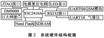 監(jiān)控系統(tǒng)控制器的核心CPU選用基于ARM920T內(nèi)核的16/32位RISC處理器 S3C2410A。該處理器功能強(qiáng)、性價(jià)比高、功耗低,提供了一套較完整的通用外圍設(shè)備接口,帶MMU(內(nèi)存管理單元),可支持Linux、μC/OS- II、WindowsCE等多種操作系統(tǒng)的移植。系統(tǒng)硬件結(jié)構(gòu)框圖如圖2所示。