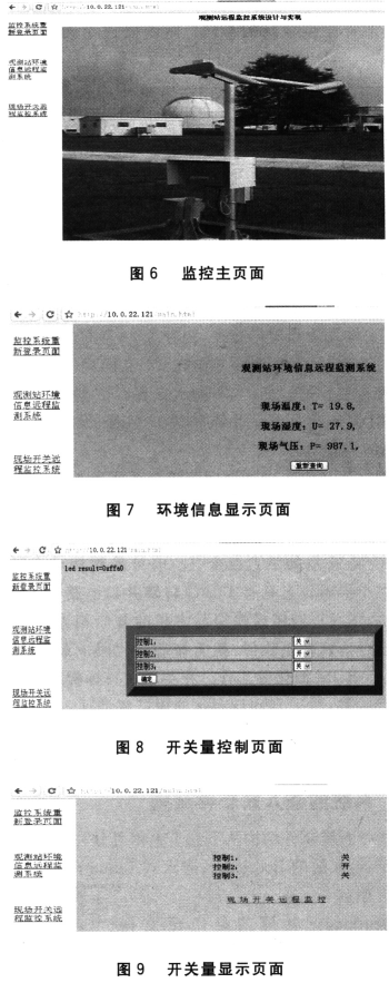 該監(jiān)控主頁面左側(cè)顯示有3個(gè)模塊:重新登陸頁面;觀測站遠(yuǎn)程環(huán)境信息檢測系統(tǒng),能方便實(shí)時(shí)地查詢現(xiàn)場的環(huán)境狀態(tài),如圖7所示;現(xiàn)場開關(guān)的遠(yuǎn)程監(jiān)控系統(tǒng),可以控制3個(gè)開關(guān)量的開關(guān),如圖8所示,并能查詢它們當(dāng)前狀態(tài),設(shè)置監(jiān)控頁面每隔15