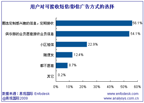 從用戶對短信廣告的接受程度來看,用戶對于自己感興趣領域的短信廣告并不反感,甚至樂于接受或定制。根據(jù)易觀國際Enfodesk發(fā)布的用戶調(diào)研數(shù)據(jù),56.1%的用戶愿意定制自己感興趣的信息,54.1%的用戶愿意接受會員信息,只有8.7%的用戶不愿意接受任何形式的短信/彩信廣告。但是這類用戶樂于接受的短信廣告反而一般有固定的端口號,更容易被攔截,因此易觀國際(Analysys International)認為,該短信過濾業(yè)務更加傾向于攔截對用戶相對更有價值的信息,造成垃圾信息“驅(qū)逐”有價值信息的結(jié)果,不利于短信廣告行業(yè)的健康發(fā)展。