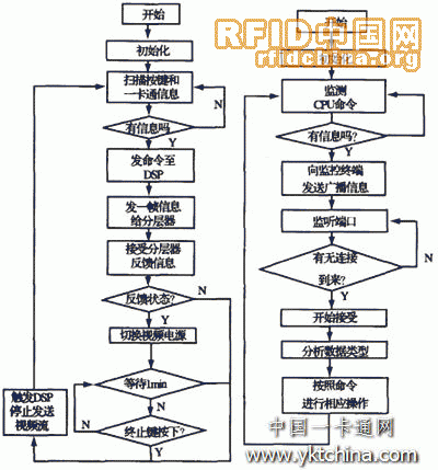對(duì)于底層軟件,主要是門口終端的控制軟件,其工作流程如圖5所示。門口終端上電后,先進(jìn)行初始化工作,然后開始掃描按鍵和一卡通信息,當(dāng)確認(rèn)有變化時(shí),微處理器CPU l先給分層器發(fā)送一幀信息,并且監(jiān)聽分層器的反饋信息,同時(shí)啟動(dòng)DSP通過(guò)網(wǎng)絡(luò)端口發(fā)送廣播消息給監(jiān)控終端,以便啟動(dòng)監(jiān)控終端的接受線程接受視頻流和訪問(wèn)信息或一卡通信息。當(dāng)時(shí)間超過(guò)l min或終止鍵按下時(shí),雙方終止通信,門口終端與監(jiān)控終端之間由CPU1觸發(fā)DSP中斷,使其停止發(fā)送視頻流數(shù)據(jù)。
