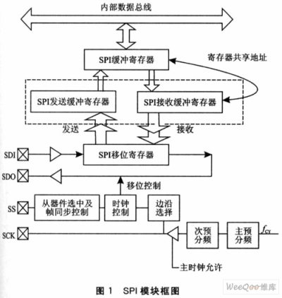 dsPIC30F6014提供了2個(gè)SPI接口模塊,每個(gè)接口模塊包括三個(gè)特殊功能寄存器和四個(gè)引腳。SPIxBUF是數(shù)據(jù)緩沖寄存器。需要注意的是,接收緩沖SPIxRBF和發(fā)送緩沖SPIxTBF共享同一個(gè)地址,即它們都是地址映射到SPIxBUF的。也就是說,當(dāng)對接收或發(fā)送緩沖寄存器操作時(shí),都只能對SPIxBUF進(jìn)行操作,而不能直接對SPIxRBF或SPIxTBF進(jìn)行操作。SPIxCON是控制寄存器,用來對sPI模塊的操作模式等進(jìn)行配置;SPIxSTAT是狀態(tài)寄存器,用來標(biāo)示SPI模塊所處的狀態(tài)。其模塊框圖如圖1所示。