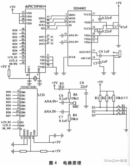 電路原理如圖4所示。整個(gè)電路由語音錄放電路、話筒輸入電路、按鍵開關(guān)電路及LCD顯示電路構(gòu)成。由于本設(shè)計(jì)輸出直接驅(qū)動普通耳機(jī),經(jīng)實(shí)驗(yàn)不需外部功放電路,直接利用ISD4002內(nèi)部功放輸出即可。ISD4002作為從機(jī),其SPI接口的MOSI接控制器的SDO;MISO接控制器的SDI;SCLK接SCK;SS接控制器的SS即可。LCD用于人機(jī)交互的界面顯示。