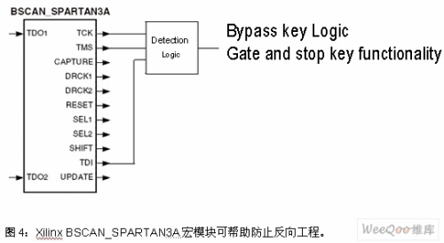 平臺中, 可在設(shè)計中使用BSCAN_SPARTAN3A宏模塊,其檢測邏輯可監(jiān)控FPGA構(gòu)造中的JTAG控制信號,如圖4所示。如果檢測到JTAG控制信號的活動,用戶在設(shè)計可以立即繞過關(guān)鍵邏輯或關(guān)斷關(guān)鍵功能,不再執(zhí)行正確的功能。這樣反向工程人員讀到的將是不正確的功能模塊,在不能完成預期功能的解決方案上浪費時間和資源。