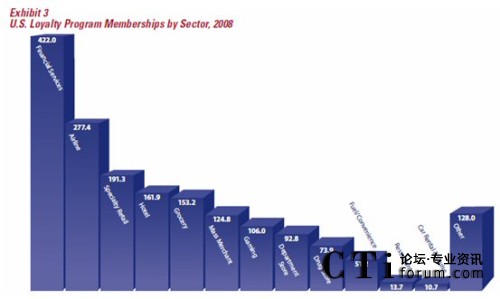 在美國(guó),忠誠(chéng)度營(yíng)銷(xiāo)應(yīng)該用為廣泛的五個(gè)行業(yè)/領(lǐng)域是金融服務(wù)(銀行、保險(xiǎn)、證券、基金等)、航空、專門(mén)零售(例如各類(lèi)的專賣(mài)店、品牌連鎖)、酒店及百貨。值得一提的是,近兩年來(lái),金融服務(wù)行業(yè)在忠誠(chéng)度營(yíng)銷(xiāo)的應(yīng)用發(fā)展迅速,各類(lèi)忠誠(chéng)度計(jì)劃的參與人數(shù)由2006年的2.388億上升到2008年的4.22億,這個(gè)增長(zhǎng)主要是由各類(lèi)具備信用卡、借記卡功能的聯(lián)名卡發(fā)行所致。