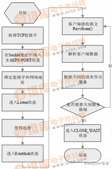 處理抽象。本應(yīng)用中需要派生一個QTcp 類,實(shí)現(xiàn)傳輸層的TCP 協(xié)議。一般基于 TCP 的網(wǎng)絡(luò)應(yīng)用程序都要繼承QTcp 類,然后在ESTABLISHED 狀態(tài)中添加 子狀態(tài)完成特定的功能。在服務(wù)器端,利用量子框架實(shí)現(xiàn)一個QServer 類,是一個活動對象,繼承自QTcp 類。QServer 活動對象同客戶端TCP Socket 連接后,進(jìn)入ESTABLISHED狀態(tài)中,通過調(diào)用Recvfrom 函數(shù)接收客戶端的請求,然后解析請求的服務(wù)類型,根據(jù)不同請求做出不同的服務(wù)。其軟件流程圖如圖1 所示: