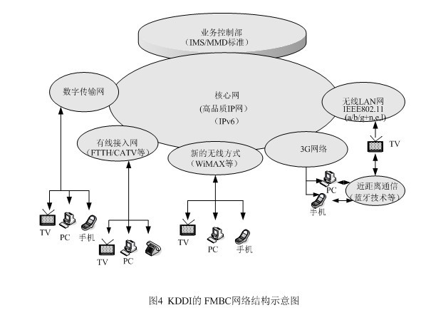 為了在市場競爭中立于不敗之地,KDDI另辟稀徑,提出了將固定網(wǎng)、移動網(wǎng)、因特網(wǎng)和電視廣播相融合的概念,它與朝日新聞、朝日電視簽署合作框架,就是它的集中代表。FMBC是超3G的構(gòu)想,是以移動通信為基礎(chǔ),與固定電話網(wǎng)及因特網(wǎng)進(jìn)行融合,現(xiàn)在又把廣播電視納入,這樣它就成了KDDI的NGN了。FMBC的網(wǎng)絡(luò)結(jié)構(gòu)請見圖4。從圖4上不難發(fā)現(xiàn)NGN的影子,特別是業(yè)務(wù)控制部的設(shè)立,并采用ISM/MMD標(biāo)準(zhǔn),將網(wǎng)絡(luò)與應(yīng)用分開,以利新業(yè)務(wù)的開拓,同時(shí)完成核心網(wǎng)的IP化,這些都是NGN的基本概念。