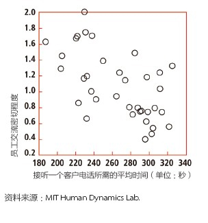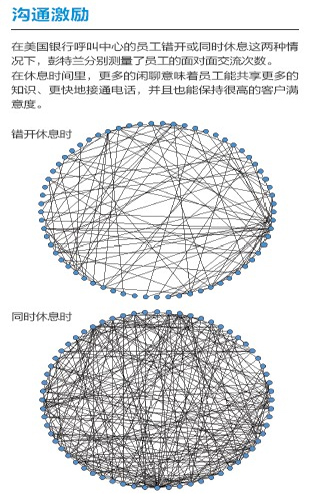 去年,彭特蘭的實驗室與美國銀行(Bank of America)設在羅得島(Rhode Island)的呼叫中心合作,在80 名中心員工身上安裝了社會傳感器。這種傳感器看起來像一枚不顯眼的徽章,使用藍牙和紅外信號監(jiān)測實驗對象每分鐘與哪些同事交談。測試活動先開展了一個月,后來又進行了6周。第一個月后,實驗室的研究人員發(fā)現(xiàn),與更多同事進行過交談的員工能夠更快地接通電話,他們自我感覺的壓力也相對較小,而客戶滿意度卻與其他人一樣高。與刻板地遵循員工手冊或服從經(jīng)理的電子郵件指示相比,通過非正式的閑聊來交流問題和解決方案似乎能取得更好的結果。有了這種結論之后,該呼叫中心嘗試盡量將員工的休息時間安排在一起,而非像過去那樣錯開。這樣員工就有了更多的時間參與閑聊。幾個月后,美國銀行向實驗室報告了結果:該呼叫中心獲得了相當于每年1,500 萬美元的生產(chǎn)力提升。