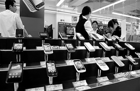 消費(fèi)者在剛剛開業(yè)的福州樂(lè)購(gòu)家電區(qū)選購(gòu)手機(jī),智能手機(jī)系統(tǒng)和軟件的發(fā)展,正在成為移動(dòng)互聯(lián)網(wǎng)發(fā)展的“助推器”