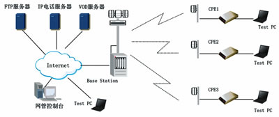 上文介紹的主要測試領(lǐng)域側(cè)重實驗室環(huán)境,運營商在對設(shè)備經(jīng)過一定程度上的實驗室測試后,一般會進(jìn)一步進(jìn)行外場測試。在外場測試中,覆蓋、容量、多終端下的QoS保證、移動性、長時傳輸能力等方面將成為重點的測試內(nèi)容,下面就針對固定WiMAX技術(shù),對其部分外場測試內(nèi)容進(jìn)行介紹(典型外場測試框圖參考圖3)。