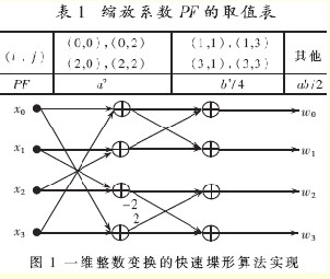 ·2q,PF稱(chēng)為縮放系數(shù),根據(jù)元素在陣列塊中的不同位置,其取值如表1所示,Qstep為量化步長(zhǎng),由0至51共52個(gè)量化參數(shù)QP決定,QP增加1,Qstep增加12.5%;q=15+QP/6,QP/6取整數(shù);對(duì)于幀內(nèi)宏塊f取2q/3,幀間宏塊f取2q/6。需要指出的是,MF的值可根據(jù)PF和QP的取值經(jīng)簡(jiǎn)單計(jì)算得到,并可形成表格,通過(guò)查表方式便可實(shí)現(xiàn)硬件運(yùn)算,并有效地提高了運(yùn)算速度。