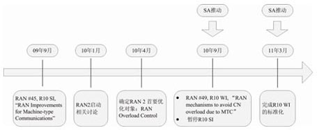 在2010年9月的RAN #49次全會上,在SA的推動下,RAN全會決定成立一個關(guān)于MTC的新的WI,用來解決避免大量MTC設(shè)備接入導致的核心網(wǎng)過載問題。2011年3月份,RAN2完成了此WI并在RAN全會上通過。圖4所示的是3GPP MTC R10標準化項目進程情況。