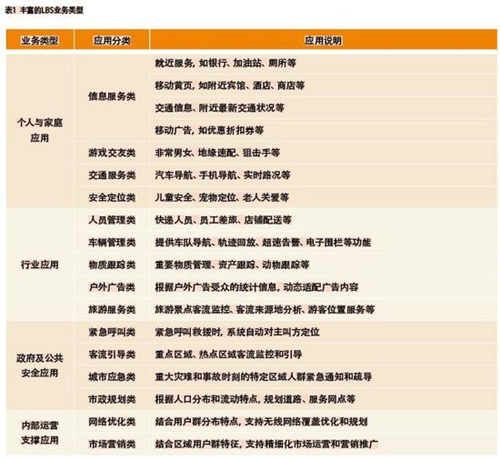 傳統(tǒng)LBS應(yīng)用主要是緊急呼叫、車輛導(dǎo)航、物流管理、人員定位等,其實(shí)LBS作為一種基本能力,可以擴(kuò)展到各類業(yè)務(wù)應(yīng)用中。根據(jù)面向的服務(wù)對(duì)象的不同,LBS業(yè)務(wù)可以分為個(gè)人與家庭應(yīng)用、行業(yè)應(yīng)用、政府與公共安全應(yīng)用和運(yùn)營商內(nèi)部運(yùn)營支撐應(yīng)用四大類型。每種LBS業(yè)務(wù)類型都包括各類豐富應(yīng)用(如表1),這里僅列舉部分應(yīng)用進(jìn)行簡要探討。