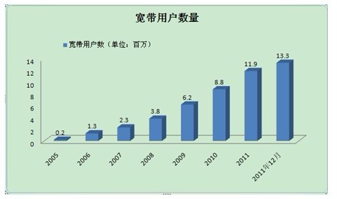 去年進(jìn)行的3G/BWA牌照拍賣有望成為一個(gè)催化劑,將寬帶接入擴(kuò)展到印度最偏遠(yuǎn)的地方。印度電信市場(chǎng)正在經(jīng)歷“信息革命”。為了促進(jìn)寬帶的普及,政府已經(jīng)公布并實(shí)施了多項(xiàng)政策(見(jiàn)方框3)。得益于這些政策的實(shí)施,寬帶用戶數(shù)從2005年的18萬(wàn)增加到2011年3月的1187萬(wàn),2011年底達(dá)到1330萬(wàn)。