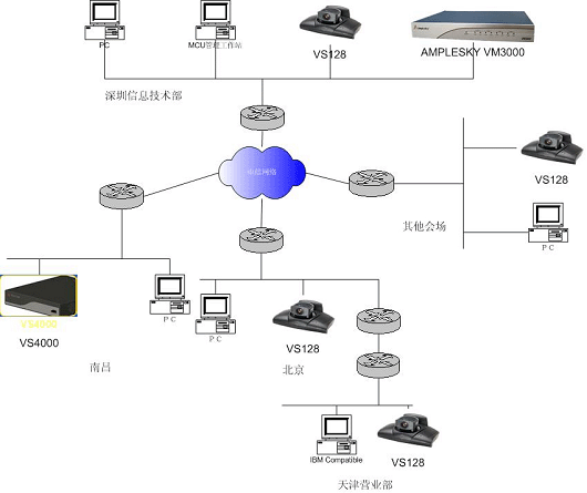 江南證券有限責(zé)任公司視頻會議系統(tǒng)的承載網(wǎng)絡(luò)即江南證券有限責(zé)任公司廣域網(wǎng)主干網(wǎng)采用DDN結(jié)構(gòu)技術(shù)非常適合開展多點(diǎn)遠(yuǎn)程視頻會議包括數(shù)據(jù)會議業(yè)務(wù)。目前,成熟的會議室級視頻會議系統(tǒng)對帶寬的要求為384K,所以江南證券有限責(zé)任公司廣域網(wǎng)512K的線路帶寬完全滿足視頻會議系統(tǒng)對帶寬的需求。但由于IP損耗等原因,真正建立的會議帶寬為384K.