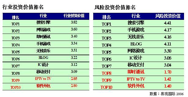 易觀國際投資分析師李璟對記者介紹:“本次評估中十大熱點(diǎn)領(lǐng)域的前8名都具有投資價(jià)值。但位居最后的 IPTV 和軟件外包行業(yè),雖然投資價(jià)值得分低于3分,并不代表其三年后沒有投資價(jià)值,易觀國際的行業(yè)投資價(jià)值評估模型是以3年作為一個評估周期的。我們認(rèn)為