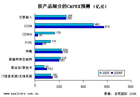 易觀國(guó)際預(yù)測(cè)2006年全國(guó)電信運(yùn)營(yíng)商的資本總開支為2053億(不包括 3G 資本開支),比2005年下降1%?偟目磥(lái),運(yùn)營(yíng)商在