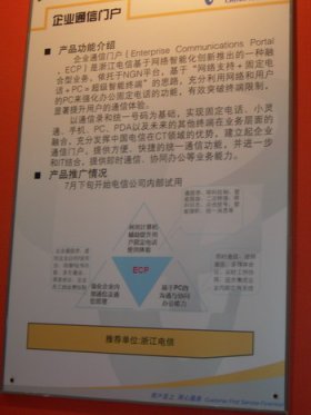 近日,中國電信在西安召開了上半年市場工作會議暨新產品展示專題研討會,在此次會議上,各省電信公司分別展示了自己面向市場開發(fā)的新型業(yè)務。其中,來自浙江電信的一種叫企業(yè)通信門戶ECP(Enterprise Communications Portal)的主推業(yè)務在展示過程中吸引了眾多目光,引起了其他與會代表的關注,被認為是中國電信拓展企業(yè)市場空間的最具潛力產品之一。