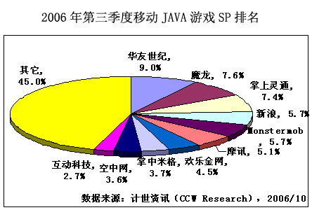 受到中國(guó)移動(dòng)對(duì)SP自消費(fèi)行為的打擊和新政影響,第三季度中國(guó)移動(dòng)JAVA業(yè)務(wù)分賬前信息費(fèi)為1.1億元,華友世紀(jì)優(yōu)勢(shì)明顯,占市場(chǎng)份額的9.0%,排名二到五位的SP分別為魔龍、掌上靈通、新浪和Monstermob,他們的市場(chǎng)份額分別為7.6%、7.4%、5.7%和5.7%。前十位廠商合計(jì)占到55.4%的市場(chǎng)份額。
