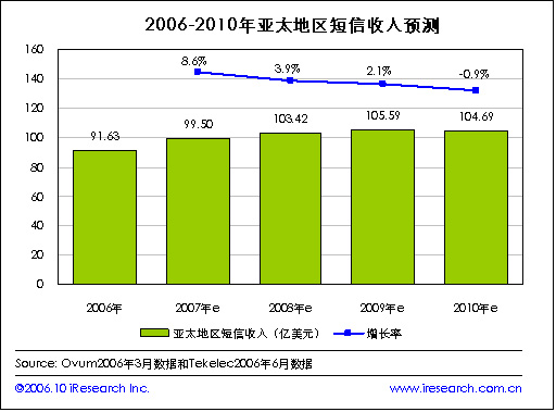 iResearch艾瑞市場咨詢根據(jù)咨詢公司Ovum和網絡應用公司Tekelec在2006年的數(shù)據(jù)整理發(fā)現(xiàn),到2010年亞太地區(qū)的短信收入有望達到104.69億美元,2006年亞太地區(qū)的短信收入在91.63億美元。