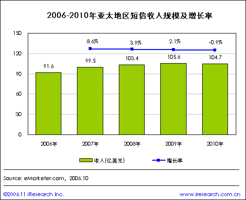 iResearch艾瑞市場咨詢整理eMarketer的相關(guān)數(shù)據(jù)顯示,2006年亞太地區(qū)短信收入將達(dá)到91.6億美元,2007年預(yù)計(jì)短信收入為99.5億美元,比2006年增長8.6%,2008年短信收入將達(dá)到103.4億美元,比2007年增長3.9%;2009年的短信收入預(yù)計(jì)為105.6億美元。預(yù)計(jì)到2010年亞太地區(qū)短信收入將達(dá)到104.9億美元,比2009年增長2.1%.