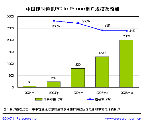 近兩年此類(lèi)業(yè)務(wù)形式逐漸被網(wǎng)民所接受,據(jù)iResearch統(tǒng)計(jì),2004年中國(guó)通過(guò)即時(shí)通訊軟件撥打普通電話的用戶僅為60萬(wàn),2006年用戶達(dá)到800萬(wàn)。如果國(guó)家相關(guān)政策可以進(jìn)一步開(kāi)放,PC to Phone 的用戶規(guī)模將會(huì)迅速增長(zhǎng)。