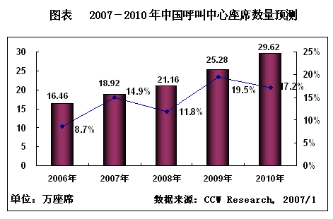 計(jì)世資訊(CCW Research)的研究成果《2006-2007年中國(guó)呼叫中心市場(chǎng)研究報(bào)告》預(yù)計(jì),2007-2010年中國(guó)呼叫中心的產(chǎn)業(yè)投入規(guī)模平均年度復(fù)合增長(zhǎng)率將超過(guò)20%,預(yù)計(jì)2007年中國(guó)呼叫中心投入規(guī)模將達(dá)到337.19億元,同比增長(zhǎng)24.8%。由于2007、2009兩個(gè)年度中國(guó)呼叫中心將開(kāi)始更換新的系統(tǒng)平臺(tái),并開(kāi)拓遠(yuǎn)程座席市場(chǎng),因此2007年的呼叫中心座席規(guī)模增長(zhǎng)率高于2006年,2009年的呼叫中心座席規(guī)模增長(zhǎng)率高于2008年。預(yù)計(jì)2007年中國(guó)呼叫中心座席數(shù)量將達(dá)到18.92萬(wàn)個(gè),同比增長(zhǎng)14.9%;而2006年呼叫中心座席數(shù)量的同比增長(zhǎng)率僅僅是8.7%,可見(jiàn)2007年的增長(zhǎng)率比2006年的高出6.2個(gè)百分點(diǎn)。計(jì)世資訊(CCW Research)研究認(rèn)為,2007年成為中國(guó)呼叫中心產(chǎn)業(yè)發(fā)展的轉(zhuǎn)折點(diǎn),2007年中國(guó)開(kāi)始進(jìn)入第二波呼叫中心建設(shè)高潮期。