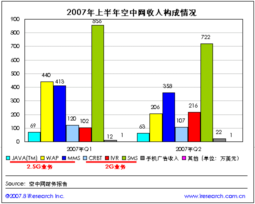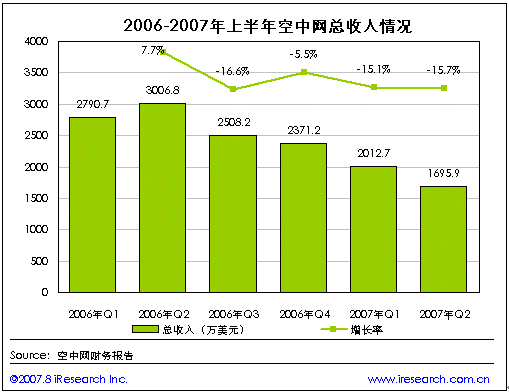 空中網(wǎng)2007年第二季度財(cái)報(bào)數(shù)據(jù)顯示,第二季度空中網(wǎng)的總收入1695.9萬美元,同比負(fù)增長43.6%,環(huán)比負(fù)增長15.7%。與第一季度相比在空中網(wǎng)兩個(gè)產(chǎn)品平臺的主要2G業(yè)務(wù)和2.5G的業(yè)務(wù)收入都出現(xiàn)了不同程度的下降,但2G業(yè)務(wù)中的IVR業(yè)務(wù)收入則出現(xiàn)了大幅上升。