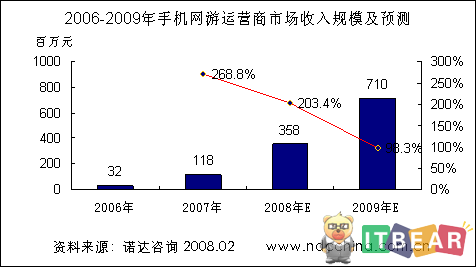 諾達咨詢報告《2008手機網(wǎng)游報告—產(chǎn)業(yè)發(fā)展與競爭策略》認為,手機網(wǎng)絡游戲已經(jīng)過了市場導入期,在未來幾年將步入快速發(fā)展階段。咨詢研究數(shù)據(jù)表明,2007年手機網(wǎng)游市場運營收入達到了1.18億元人民幣,今年將達3.58億元人民幣,到2009年市場規(guī)模有望突破7.0億元人民幣。